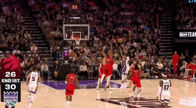 第一节比赛中,蒙克LOGO超远三分压哨投进,国王首节30-26领先猛龙。